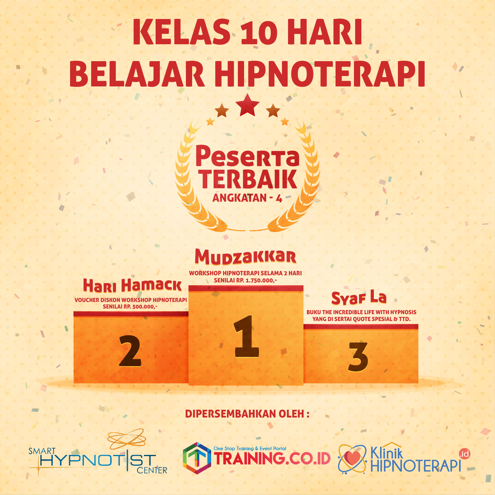 Peserta berhak mendapatkan hadiah tersebut diatas dan Sertifikat yang akan di kirimkan ke alamat masing masing peserta, dan hebatnya Kelas 10 Hari Belajar Hipnoterapi ini 100% GRATISS Tanpa biaya registrasi bahkan biaya pengiriman hadiah di tanggung oleh pihak Smart Hipnotis Center sebagai penyelengara.